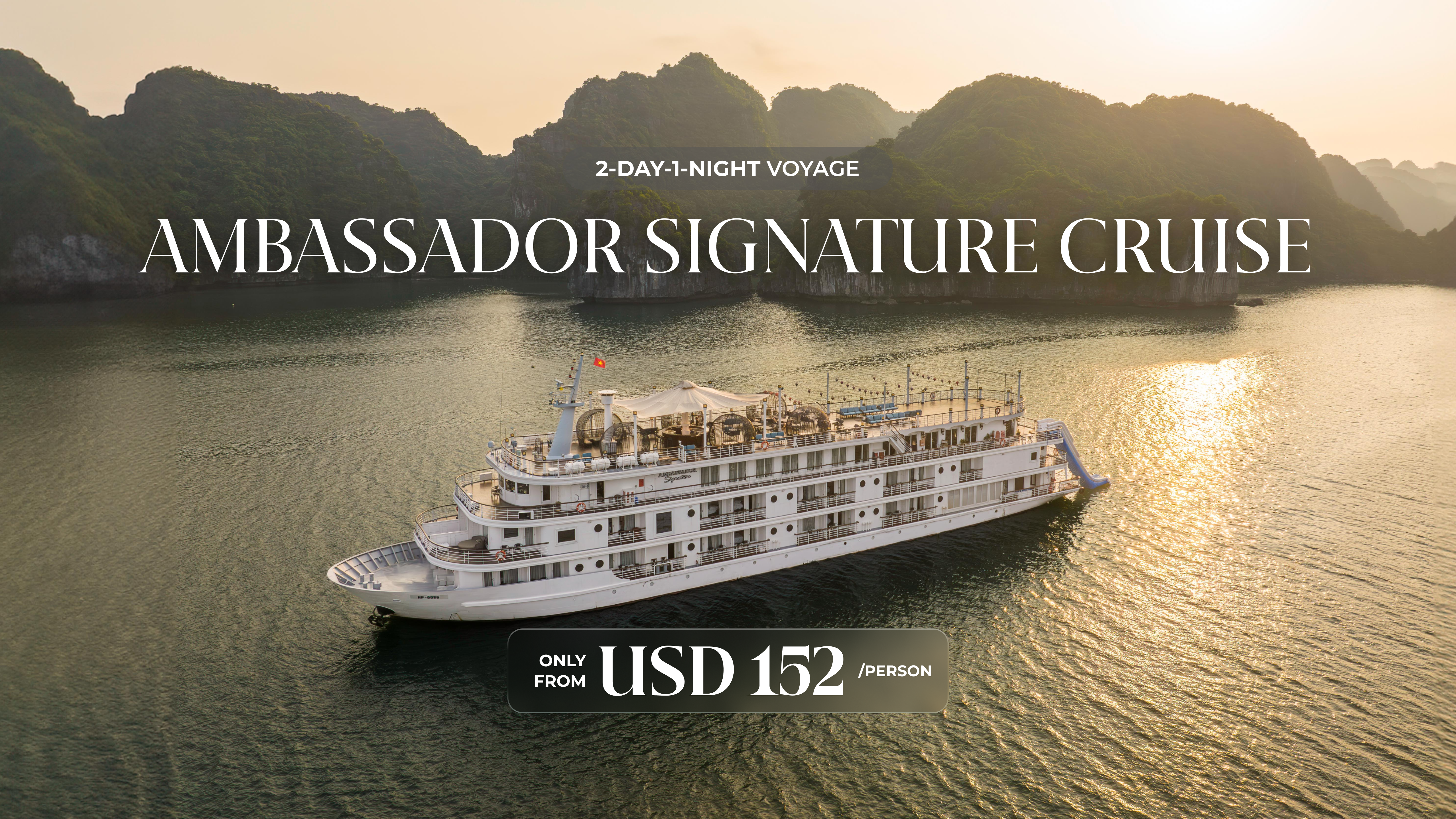 The Ambassador Signature, the latest addition to the Ambassador Cruise Line fleet, complements its Halong Bay sister ships, Ambassador I and Ambassador II. With a mere 39 expansive cabins starting at 28 sqm, each featuring a balcony and a well-appointed ensuite bath, it offers a luxurious haven. Additionally, the ship boasts a spa, a refined piano lounge, and a sundeck adorned with comfortable loungers for your ultimate relaxation.