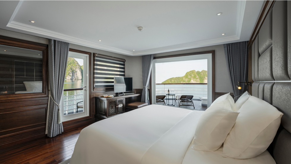 The Ambassador Balcony Suite, nestled on the second deck of the Ambassador Signature, offers state-of-the-art amenities, an en-suite bathroom including a bathtub, and a private terrace providing breathtaking views of the bay.